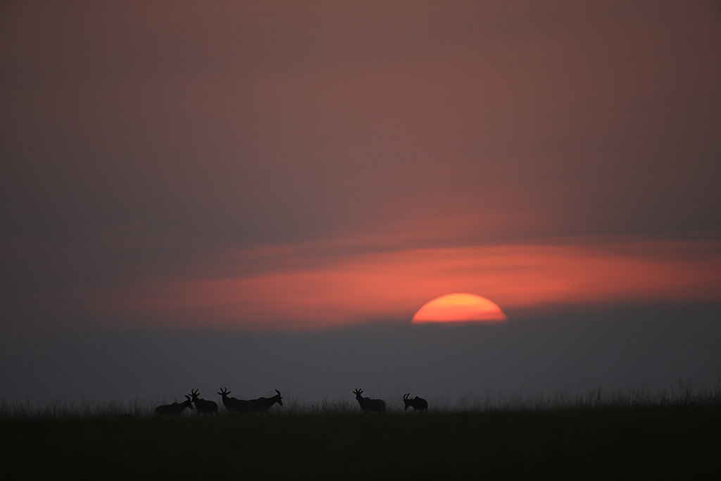 On the vast Kenyan savannah in Africa, I aimed from the sunroof of a safari car at a scene of several topis standing at the top of a gently sloping hill with the sun slowly sinking in the background.