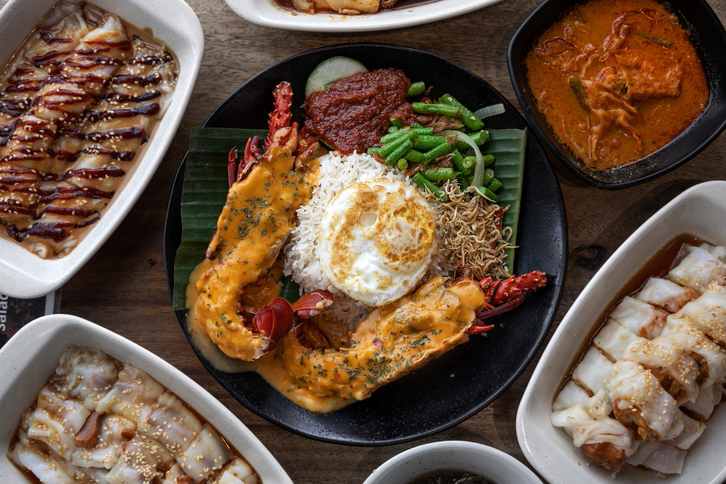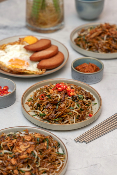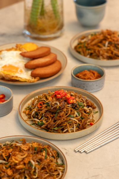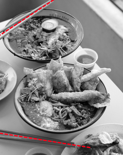 Placing utensils around the food makes it look more authentic and inviting, and can also help complete the composition. In this lor mee example, the chopsticks are also leading lines that frame and emphasise the two noodle dishes.