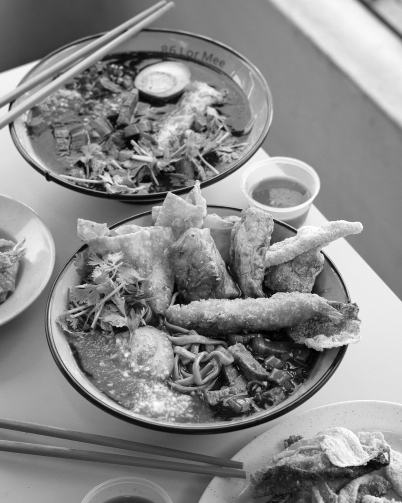 I usually arrange the key ingredients in a dish so that the “hero” ingredient is more prominent. For example, the key ingredients in lor mee (shown in the image above) are the fishcakes, fried dumplings, and ngoh hiang (pork rolls in beancurd skin) so I’ve placed them on top along with the chilli and condiments. The noodles are at the base. I asked for the ingredients to be placed only after the thick gravy was ladled onto the noodles so that they would not be covered.