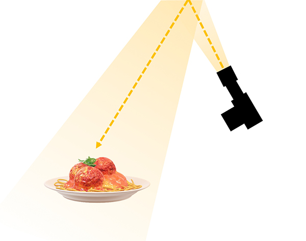 The ideal lighting is indirect natural light originating from behind the food or from the sides. Front light (light from the same direction as the camera) will make the food look less three-dimensional. While I carry a Speedlite for use in dim lighting conditions, I prefer to shoot in the daytime with natural light. I try to sit where natural light is available.