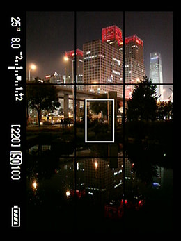 On the EOS 5D Mark II, a Live View shooting button can be found at the bottom left of the viewfinder on the rear face of the camera. Press this button to start Live View shooting. As the mirror is always flipped up during Live View shooting (except during Quick AF), there is minimal mirror shock when you release the shutter. This is also perfect for capturing night photos at a slow shutter speed, where camera shake is likely to occur.