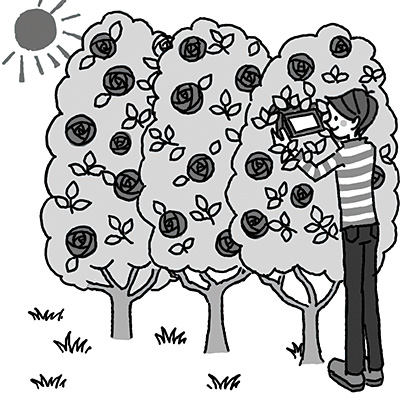 I placed my lens among the blooming roses for this shot. Since I couldn’t use a tripod, I held the camera in my hands and determined the composition by using the LCD monitor screen in Live View. I focused on a rose blooming in the front. Doing so allowed me to blur the plant in front, resulting in an expression with a sense of denseness. I recommend that you take the photo in backlight as the light shining on the leaves will glitter brilliantly.