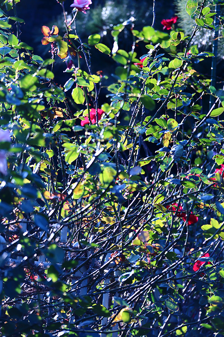 I took the row of rose buds from the side instead of the front. I wanted to capture the barely visible pink roses in a sea of green by overlapping the light shining on the leaves with the rose leaves forming several layers.
