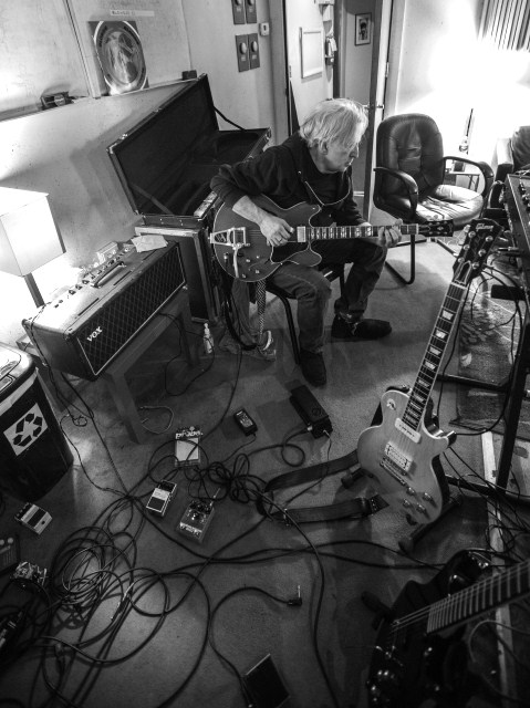 To me, Chris Stein (Blondie) is the music wizard of Blondie as well as an accomplished photographer. I’ve bunked at his home several times, and he’s been to mine. In this picture, he was doing his mojo guitar fret work in the Magic Shop studio in New York City. This was where David Bowie recorded his final two phenomenal albums, The Next Day and Blackstar. Sadly, the studio has since been closed. Blondie is the last major band to have recorded there. I was lucky and honoured to have spent two weeks watching this legendary band craft out their new album.