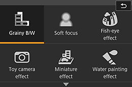 Selecting the [Creative filter modes] shooting mode displays large icons on the back panel LCD screen, and you can choose the effect you want from them.