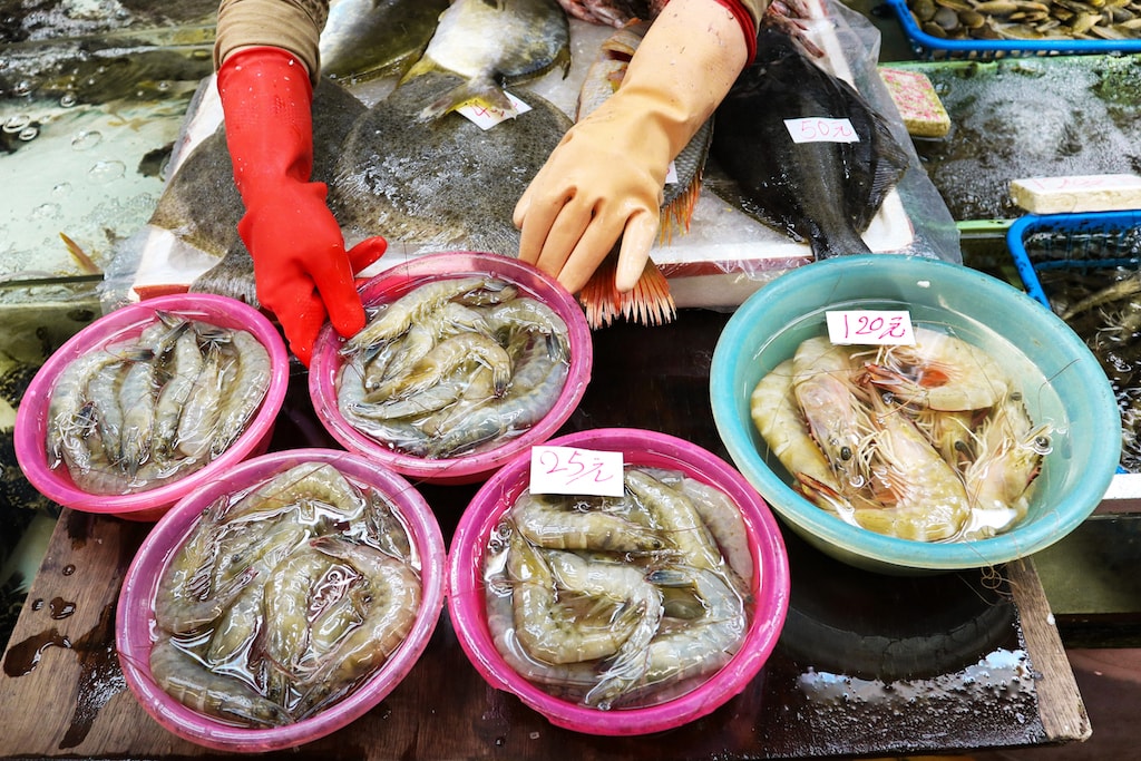 A vendor displays fresh seafood in colourful containers. Hong Kong is one of the world’s largest port-cities where Cantonese-style seafood is tradition.