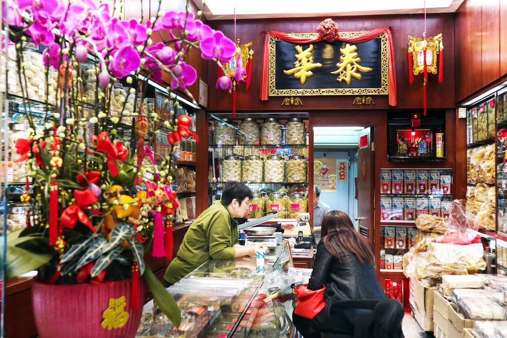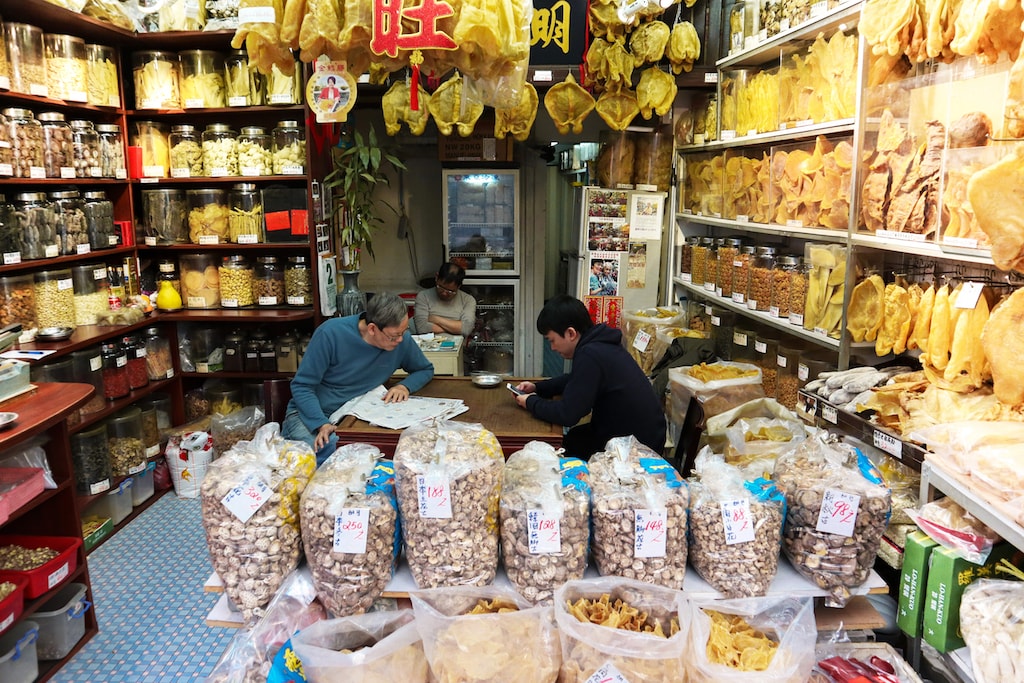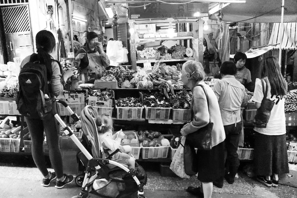 Women crowd around a local produce store and haggle with the shopkeeper. These stalls are scattered around Hong Kong, from regular shopping streets to markets.