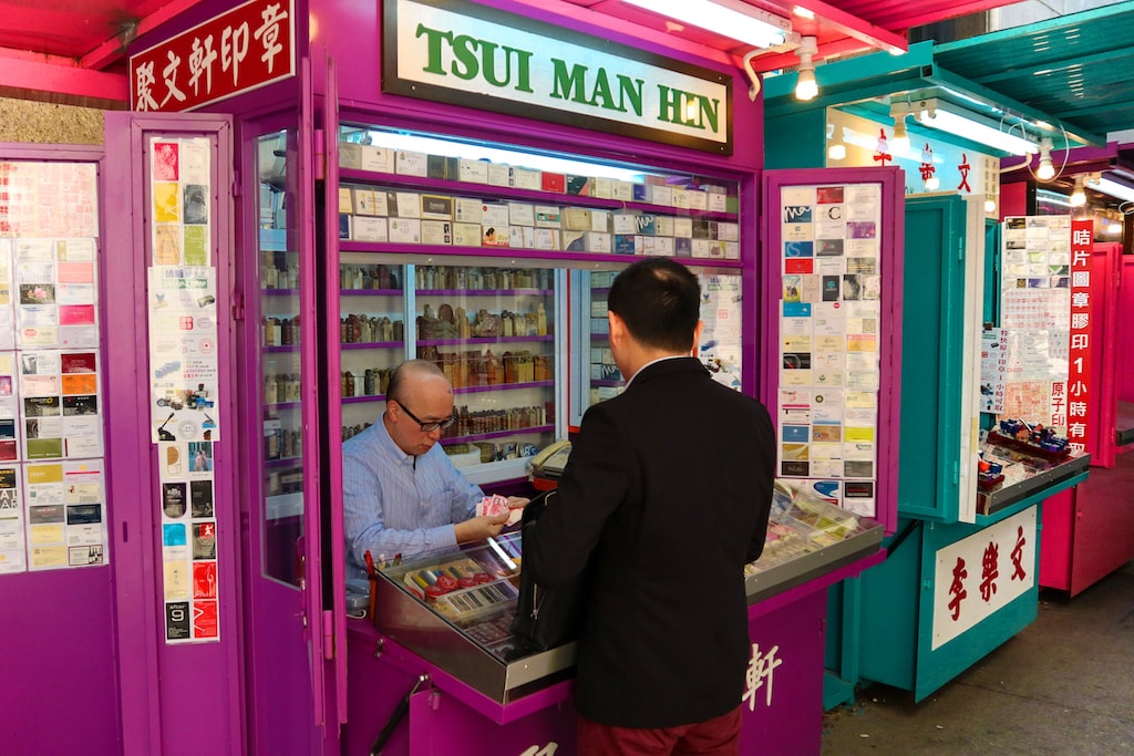 Man Wa Lane, also commonly known as Chop Alley, is a lane in Sheung Wan that spans from Bonham Strand to Connaught Road Central. The lane is famous for stalls of chop-makers, who make chops ranging from traditional Chinese seals to modern rubber stamps. Some stalls also offer services to print various cards.