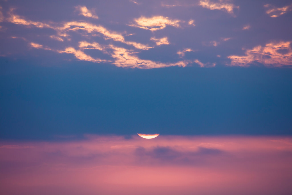 A shot of the sunset hidden behind a layer of clouds taken in Amakusa (Kumamoto Prefecture) at a focal length of 400mm. I purposely composed this image to have a strong graphical element.