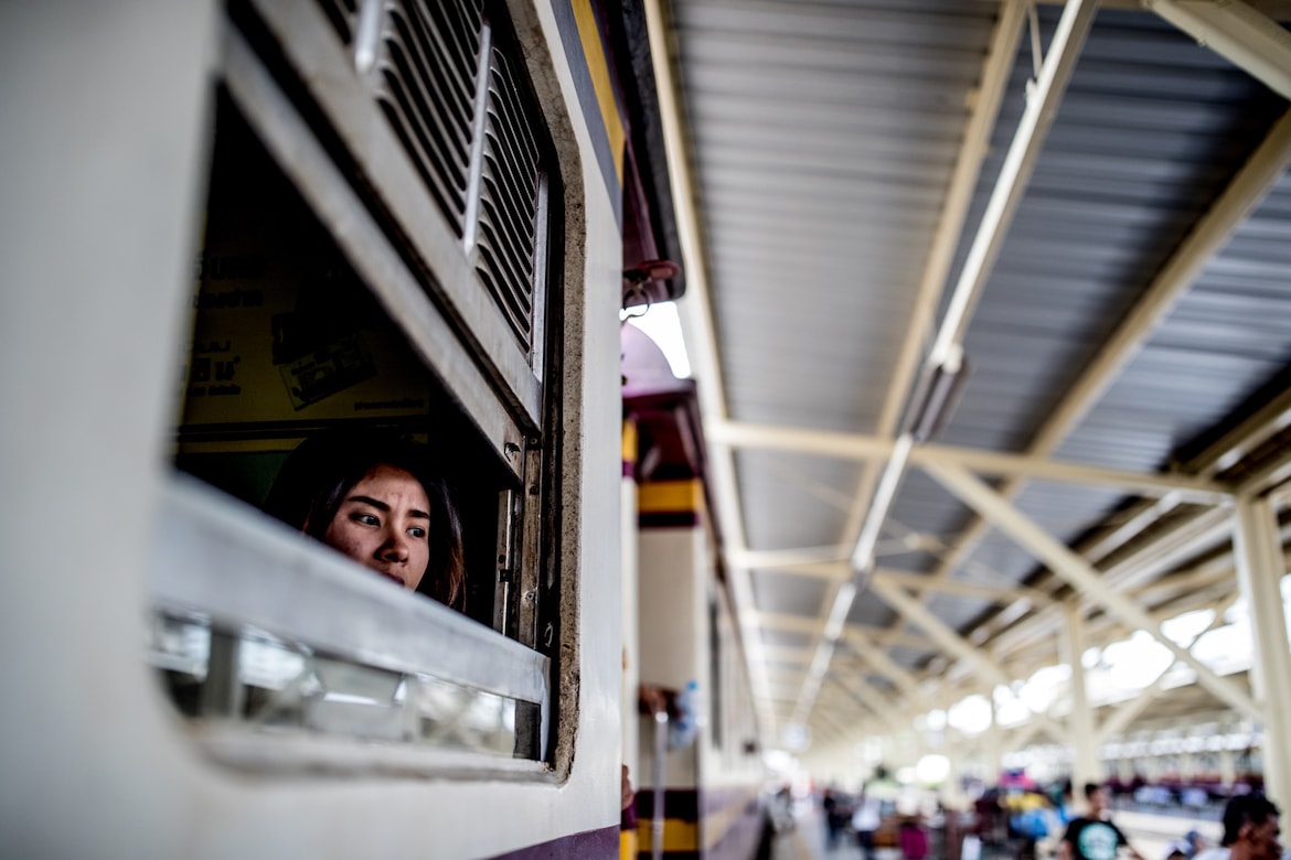 A woman looks out the window of a passenger car of an outward bound Bangkok train.