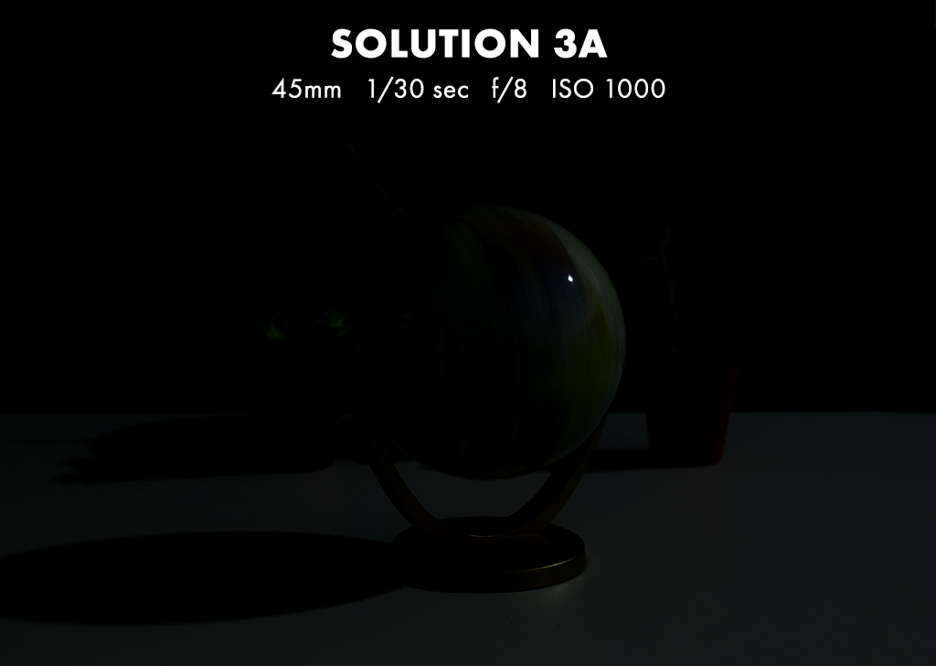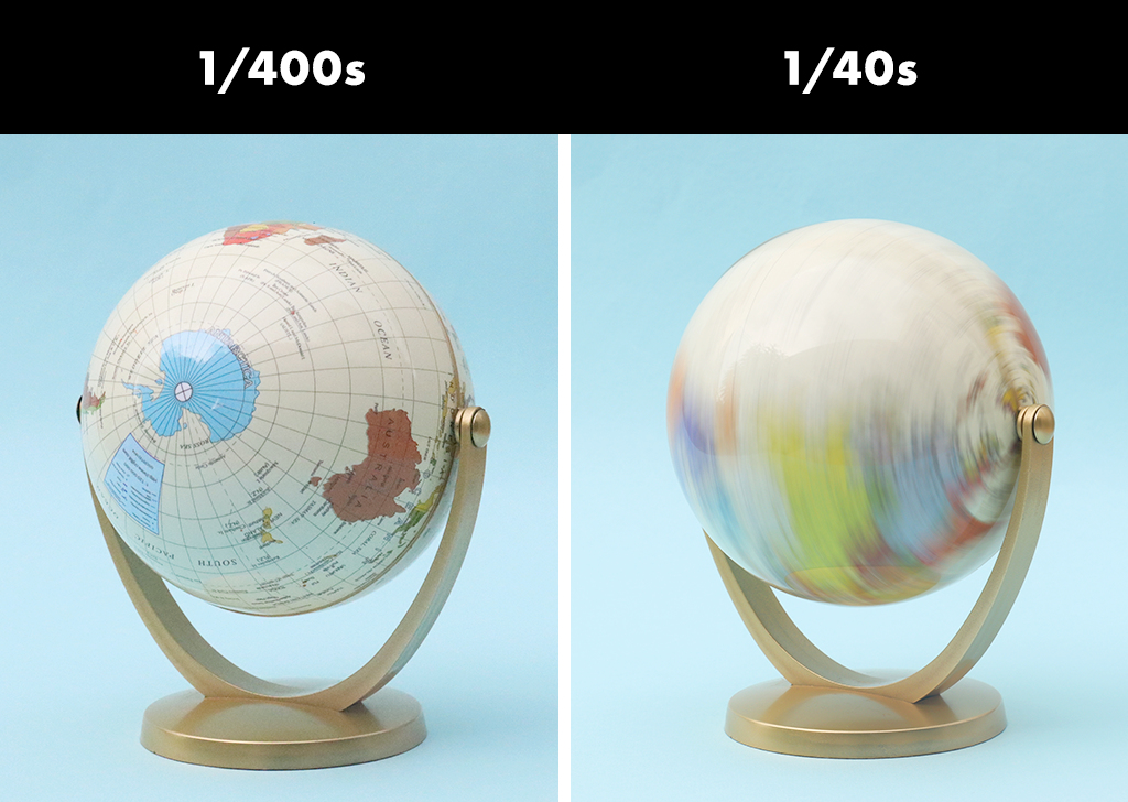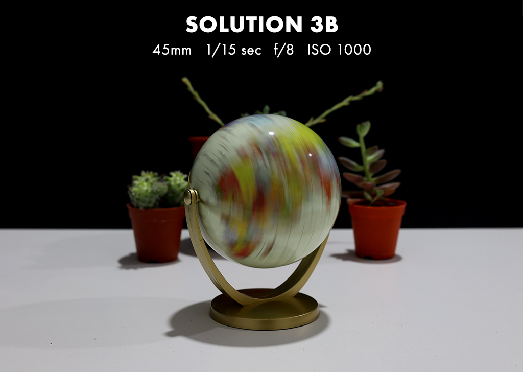 Solution B: In this case, you should work to compensate with external factors like introducing a light source (so you don’t have to only use a high ISO value to brighten the image) or to switch up your scene. To decrease the blur of your plants, you can move them closer to the globe, while manually spinning the globe slower to capture the details without using a faster shutter speed.