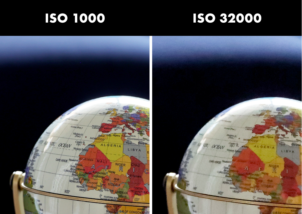 ISO refers to the graininess and the sensitivity of your camera to light. A low ISO value produces less noise in the image and has a lower sensitivity to light. A higher ISO value produces more visible noise and has higher sensitivity to light.