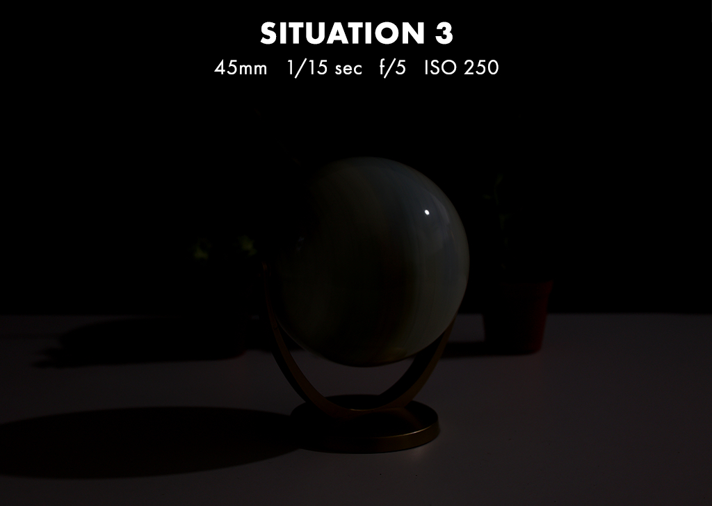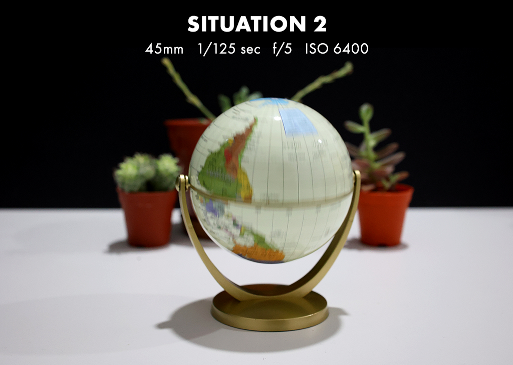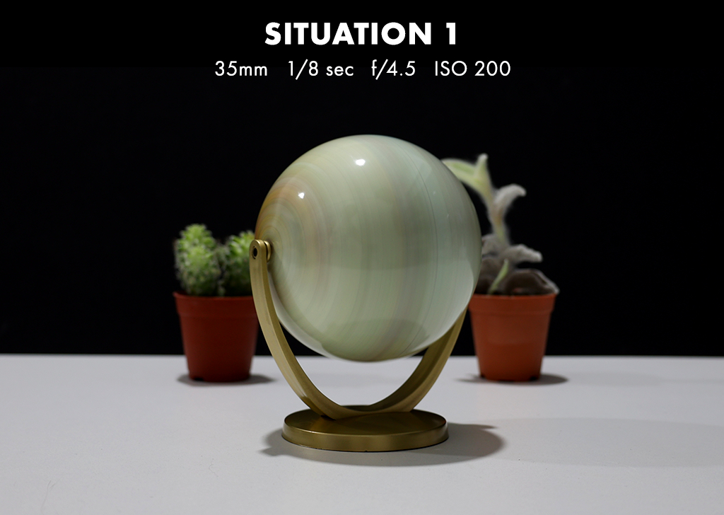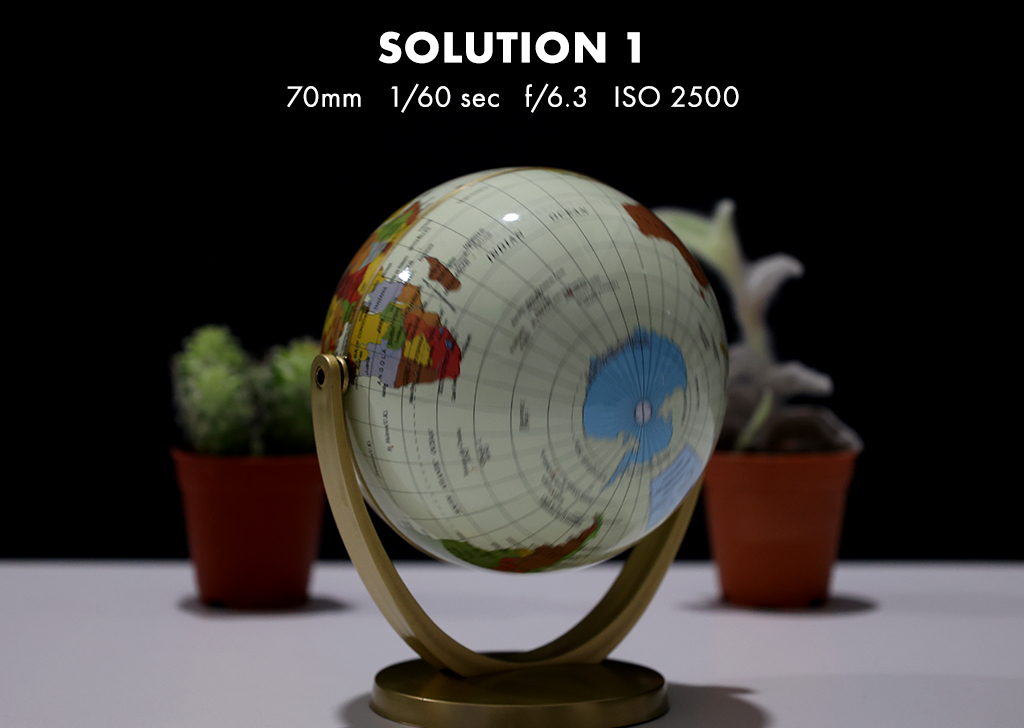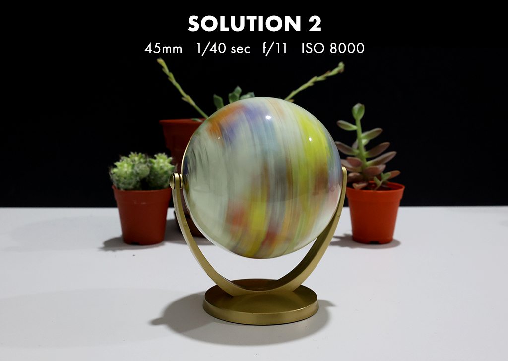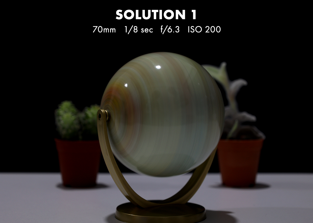 Solution: If you’re not satisfied with the result even after using the largest aperture to achieve the shallowest depth of field, you can utilise a longer focal length (35mm to 70mm) to compress the background and magnify the blur outside of the globe (focal point). This will, however, increase your f-stops and thus darken the image. To capture more globe details, we opted to use a faster shutter speed (1/8s to 1/60s), which also darkened the image.