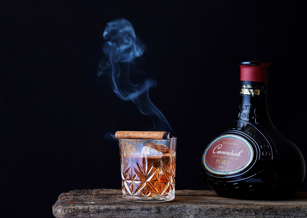 The natural light coming from the window and the black background captures the upward flight of the smoke from the cinnamon bark. Fake ice cubes and cinnamon dust add a kick to the image.