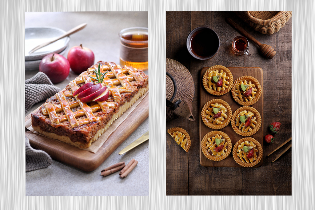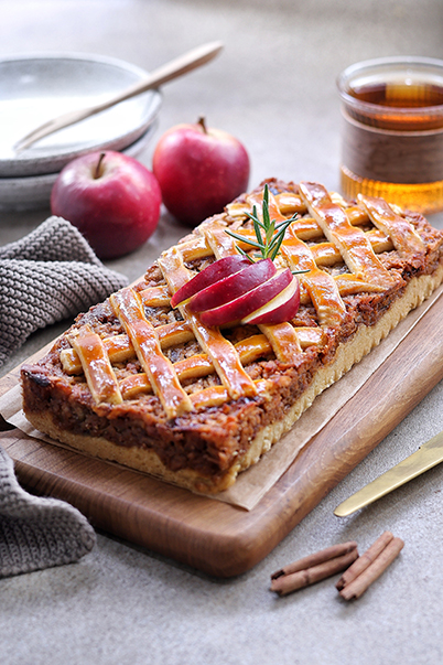 For the apple pie shots in the first image, I added the green rosemary as an accent to contrast with the analogous brown and red of the apple pie. Rosemary completes the snacktime "story" as can also be dipped in tea to add flavour!