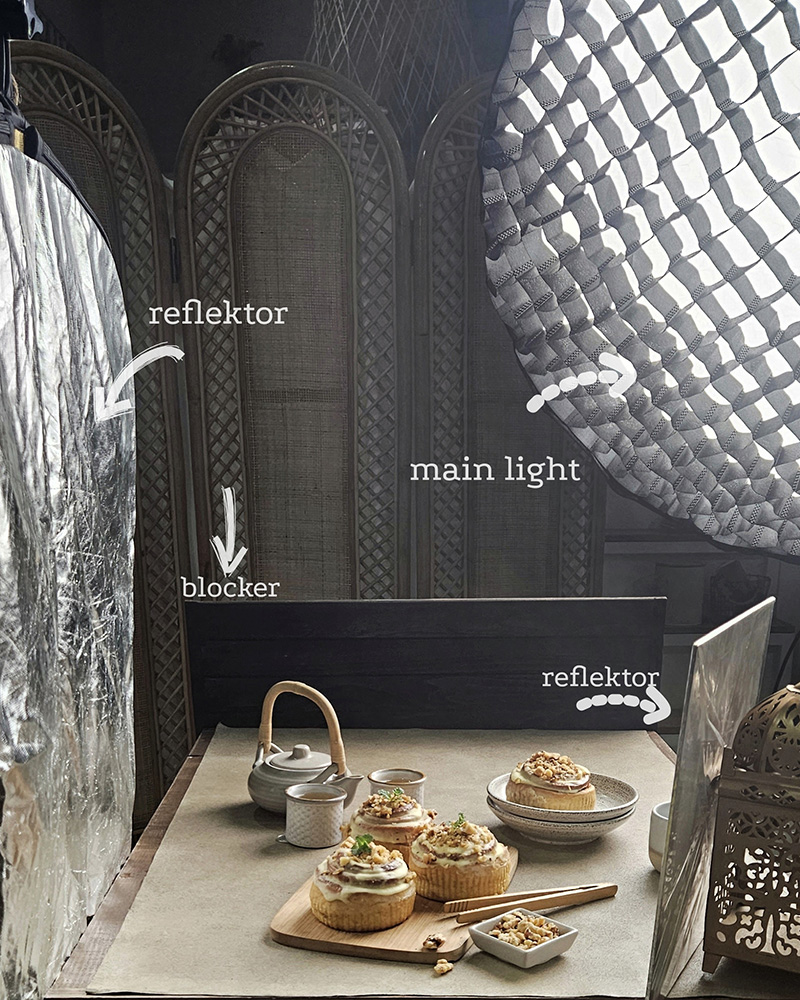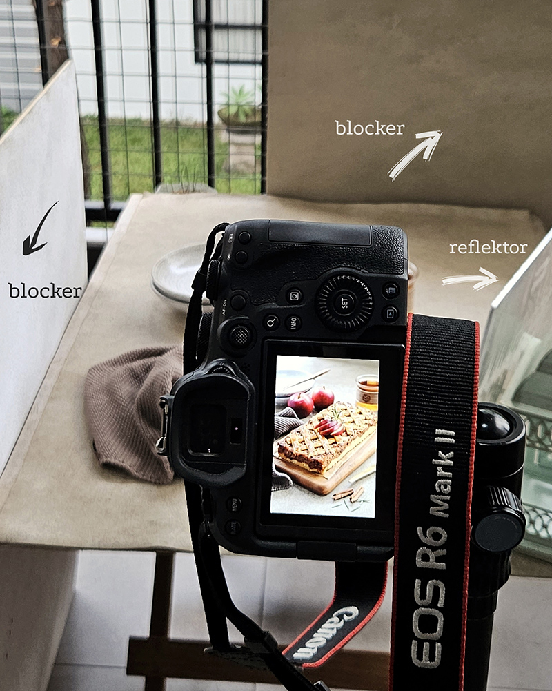 Prepare blockers and reflectors: these are useful even for natural light shoots. You can DIY your own from cardboard or any firm sheet. My reflector is a silver-covered plywood cake base I bought very cheaply from a cake shop.