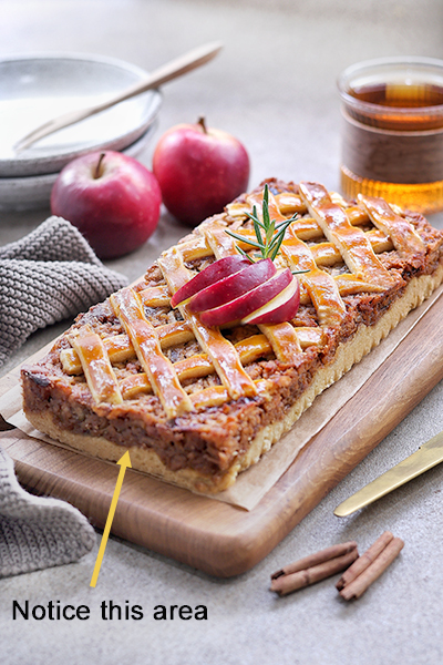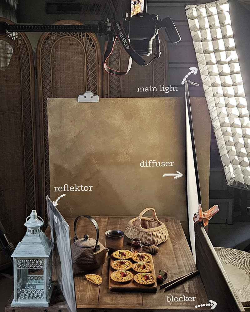The blockers in this setup control natural light so it looks like side lighting shining from a window from around 45° behind the subject scene. They add slight shadows to the bottom left and top right of the image, focusing our attention on the textured top of the pie.