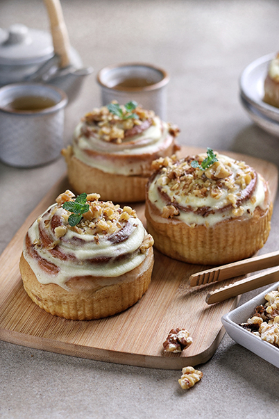 The shots of the apple pie above, and the cinnamon buns below, are what I call a “bright mood style”. The shadows are deeper and more nuanced than the conventional “light and airy” look.