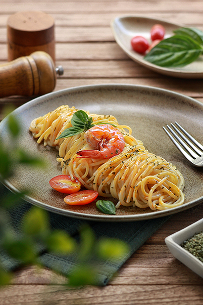 For commercial food photography, we want to avoid distorting the shape of the food, so we generally don’t use a focal length that’s too wide. At least 50mm is ideal in most cases, though you can go slightly wider for flat lays since distortion is less obvious from a head-on angle.