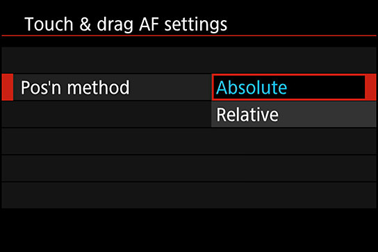 There are two position methods available: “Absolute”, where the AF frame moves to the position you touch or where you drag it to on the screen, and “Relative”, where the frame moves relative to the direction and distance you drag. You can also restrict the area of the screen available for touch and drag operations, with 7 different area options to choose from.
