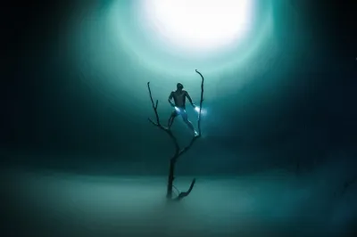 I believe that the combination of the landscapes that are almost what we are used to seeing on land combined with flowing hair, the ability to climb into a tree in a dress, or even portraying an illusion of flight all help create a surreal effect. I guess it all just really started when I sank a bunch of my friend’s porch furniture in the middle of a shark dive, and sat a few people in clothes down in the chairs, put a remotely triggered strobe under a lamp, and waited for the sharks to do their thing. From there, I realized how much doing something we are used to seeing on land can really tickle the senses. We know there is something wrong, about this picture, but we just can’t really put our finger on it… and then all sorts of questions about human abilities and scary animals arise, which makes the conversation about the images flow. When I saw how that formula worked, I started thinking of other cool ways to relate to the everyday human senses.