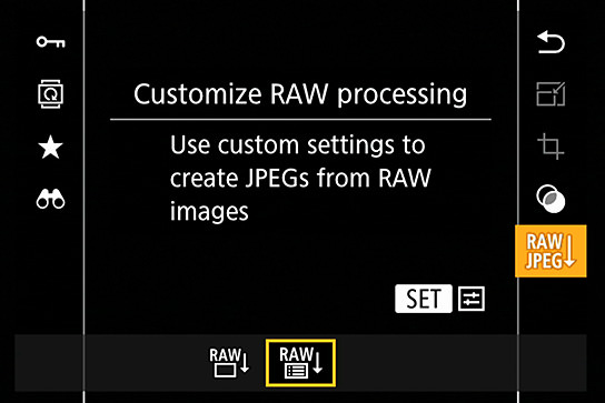 2. Press the [Set] button, select [RAW JPEG], then [Customize RAW processing], and press the [Set] button.