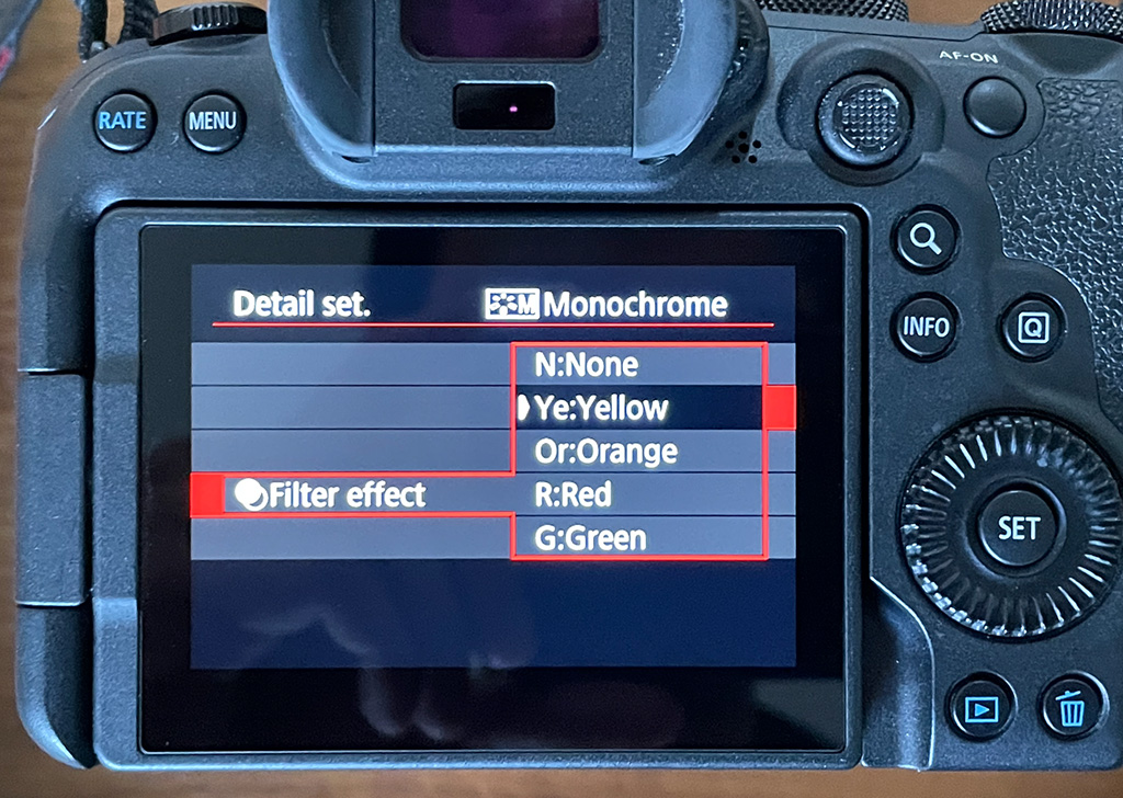 1) In your Canon camera, set it to the Monochrome function. Now when you access the camera settings, you should be able to see the Filter and Tone options. From there, you can choose what filter you want to apply in your next shot.