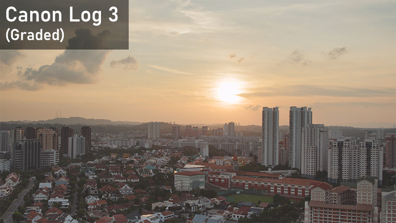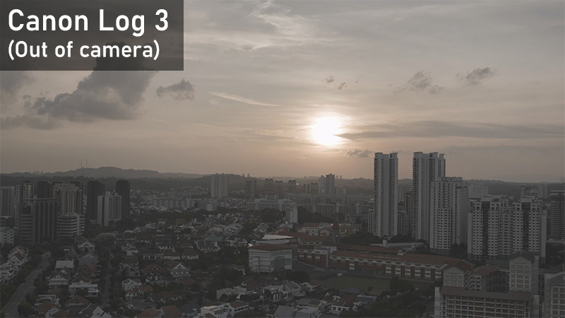 While Log footage appears relatively flat out of the camera, it retains more details in highlights and shadows—notice the higher visibility of the sky details around the sun in the screenshots from the Canon Log 3 footage. This helps tonal transitions remain smooth even when the footage is graded.