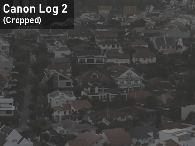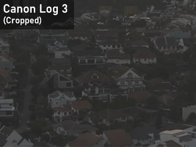 In the close-up crops, details in the shadow areas, such as the trees surrounding the houses, are more distinct in the Canon Log 2 footage than the Log 3 footage.