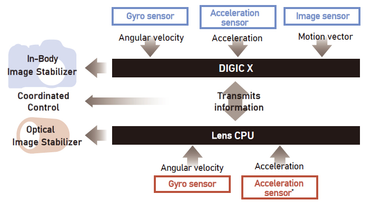 The camera uses this information to determine the volume, direction, and speed of camera shake, allowing it to shift the image sensor to stabilise the image. When a lens with in-lens (optical) image stabilisation (Optical IS) is attached, camera shake information from the gyro and acceleration sensors in the lens is also incorporated into the image stabilisation calculations to perform Coordinated Control IS.