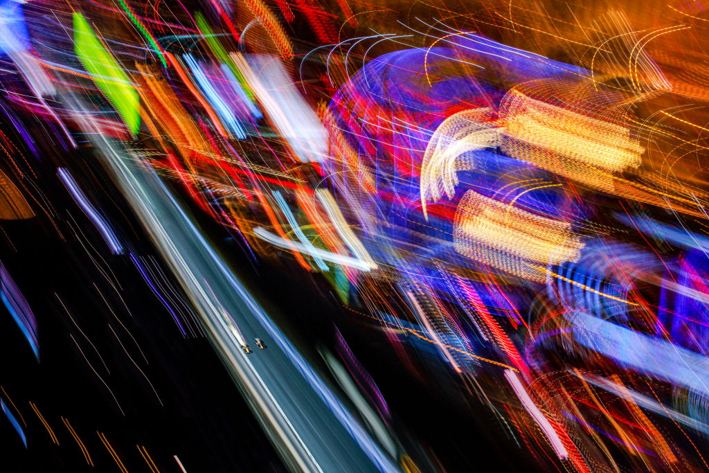 City lights transformed into brushstrokes of paint, smeared into streaks of colour like the view outside a speeding F1 car, juxtaposing stillness and motion in a way that evokes dizzying speed.