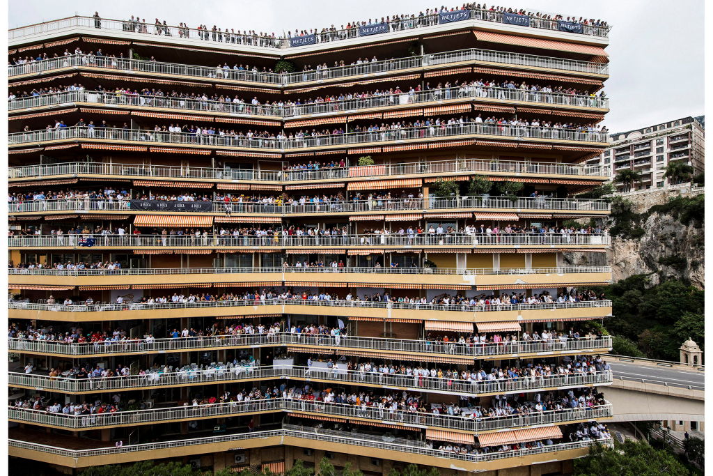 Yet another image transfers our attention to the other side of the circuit, where spectators fill the balconies of the multi-storied Panorama Building to watch the 2018 Monaco Grand Prix.