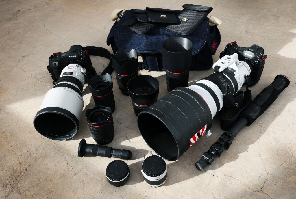 Darren's race day gear includes two EOS R1s, his lenses, and monopods and filters.