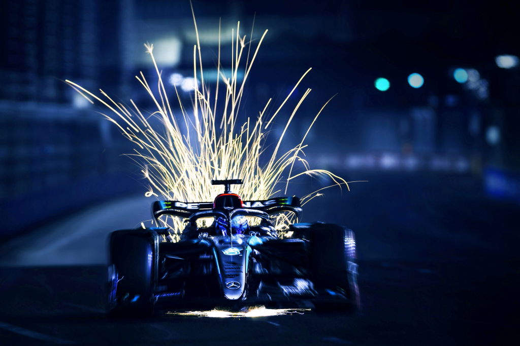 Titanium sparks shoot from George Russell’s Mercedes as he claims pole position at the Las Vegas Strip Circuit. “It’s a situation I never would have shot with autofocus on a DSLR”, Darren tells us, due to the speed of the cars coming down the Strip—F1’s longest straight section—and the high propensity for overtaking. The EOS R1’s Servo AF mode locked firmly on the car, making it possible to capture the shot without compromising composition—and with a beautiful crown of sparks to top it off.