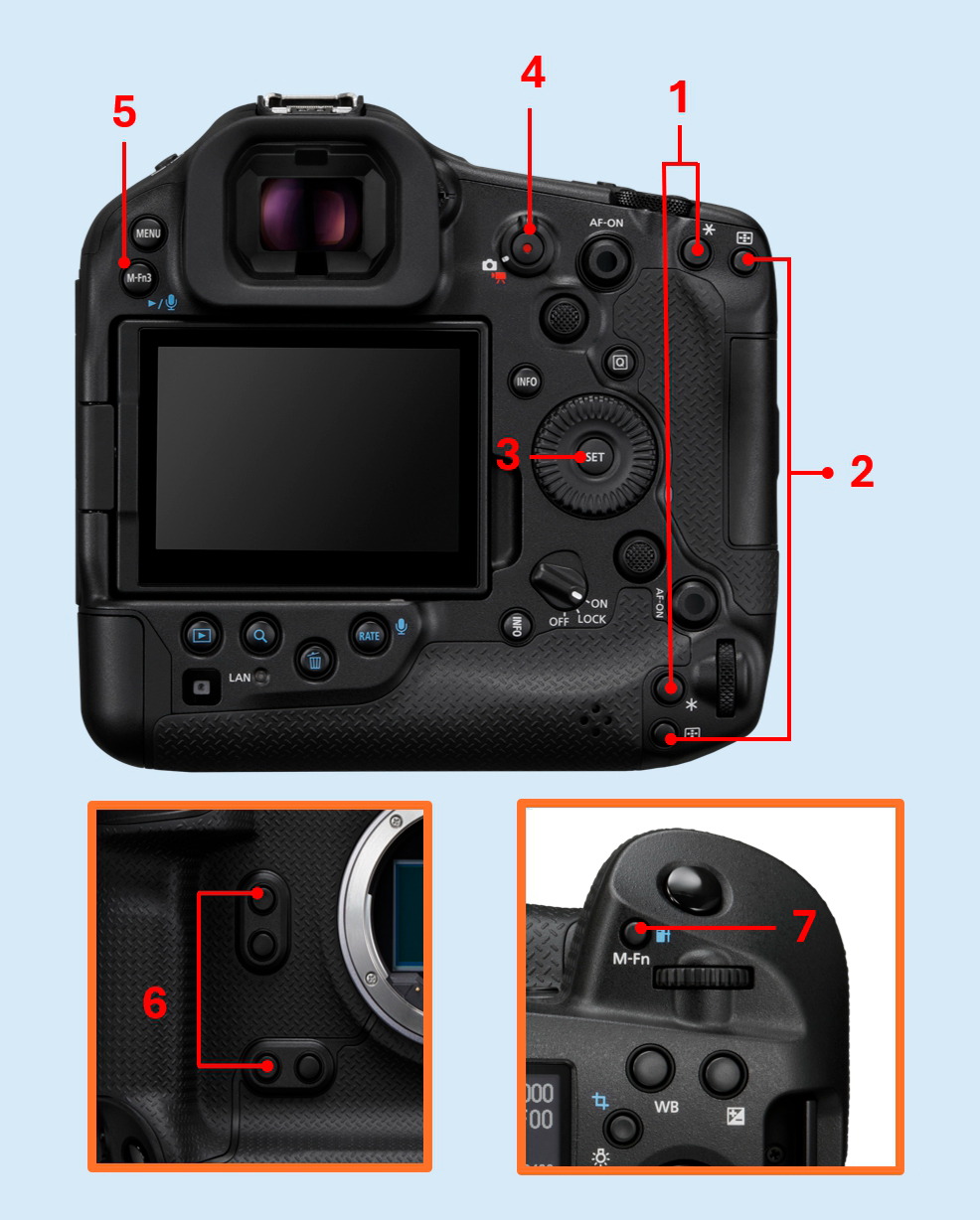 | 6 | Multi-function button 2 (Start/stop whole area AF tracking) | Direct AF point selection |