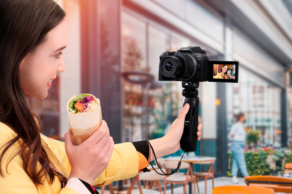 APS-C cameras provide a comfortable balance between high image quality, interchangeable lens compatibility, and travelling light. Their larger image sensor achieves better dynamic range and detail than the average smartphone or compact camera. They also can do many things that full-frame cameras can do, but are smaller, lighter, and generally more affordable. Small APS-C cameras like the EOS R10 are easy to stabilise during handheld vlogging!