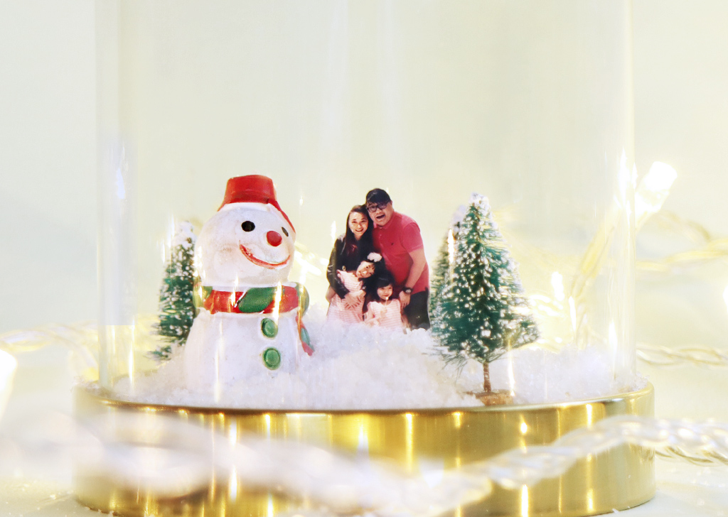 Wish you were celebrating the festive season in a winter wonderland? Now you can, with this playful twist on a Christmas snow globe! Print your favourite family portrait and incorporate it with festive elements such as a mini snowman and tiny Christmas trees within a dome. No snow where you are? No problem. Create your own snow by piling up coarse/fine sugar and shine light on the ‘snow’ so that it looks more realistic. Finally, tie fairy lights around the dome to add a dreamy, festive glow to your photo.