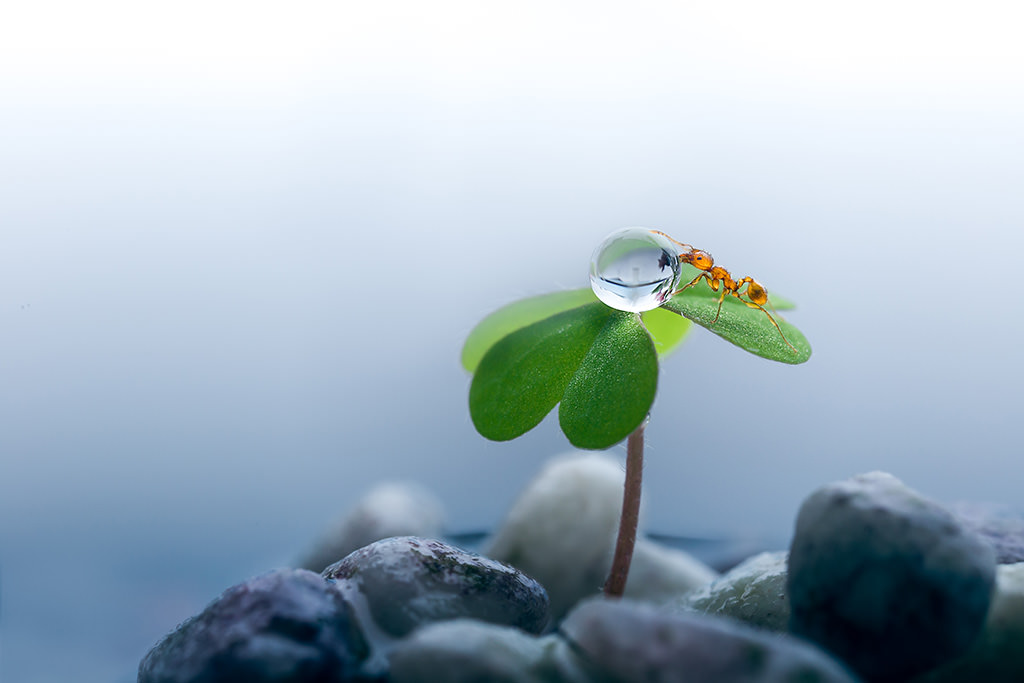 I placed an acryl plate and a towel under the feet of the tripod to make it easier to slide back and forth. This makes focusing easier. When an ant approached the water droplet, I moved the tripod gently back and forth so that the camera could focus on the eye of the ant. This was shot with 2.0x magnification.