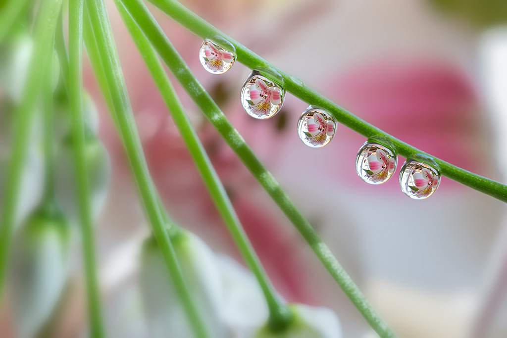 In the actual scene, the stem from which the drops of water hung was horizontal. I tweaked the composition by tilting the camera. Note that If I had used a regular 100mm macro lens, the water droplets would have appeared smaller and there would have been unnecessary reflection. Here I adjusted the magnification ratio to about 1.5 times, establishing focus on the flowers reflected in the water droplets.