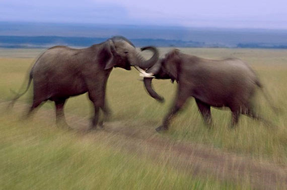 D: During my first trip to Kenya, we passed two bull elephants in a fight. Instinctively we stopped to photograph the action. Hearing the camera clicks and our excitement, the elephants suddenly stopped and stared at us. We froze; it would have been disastrous if the elephants had charged towards us. Fortunately, they continued their fight. It was a moment of cold sweat.