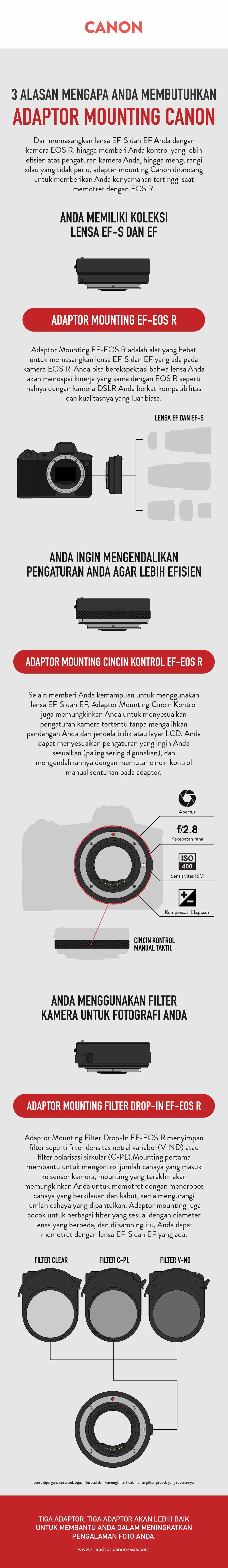 Adaptor Mounting Filter Drop-In tidak hanya memungkinkan Anda untuk memasangkan kamera EOS R dengan lensa EF-S dan EF, ia juga dapat menahan filter seperti filter densitas netral variabel (V-ND), yang membantu menjaga eksposur kontrol dengan hanya memasukkan jumlah cahaya yang diinginkan untuk masuk ke kamera; filter polarisasi sirkular (C-PL), yang membantu Anda memfilter refleksi yang tidak diinginkan atau menambahkan refleksi atau meningkatkan warna pada subjek Anda; serta filter clear (CL) untuk perlindungan lensa.