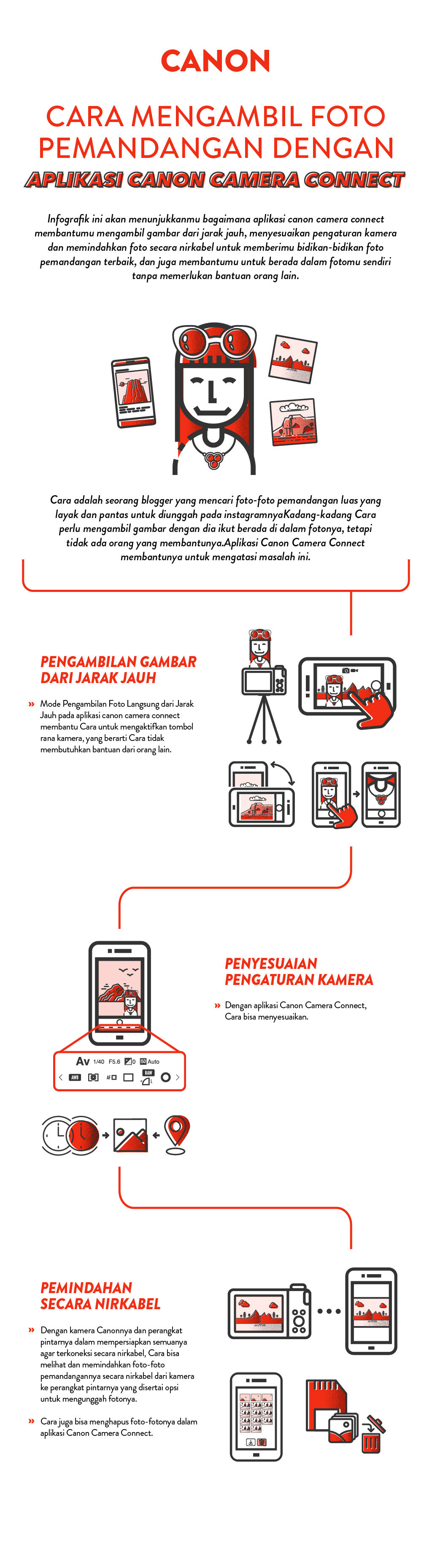 Bila kamu mengambil foto-foto pemandangan dengan kamu ditampilkan di dalam fotonya, kamu membutuhkan bantuan seseorang untuk mengambil fotonyaInfografik ini akan menunjukkanmu bagaimana cara fitur dari aplikasi Canon Camera Connect membantumu dalam mengambil gambar dari jarak jauh, bisa menyesuaikan pengaturannya sesuai yang kamu mau dan memindahkan foto yang sudah kamu ambil secara nirkabel untuk memberimu bidikan-bidikan foto pemandangan terbaik, dan juga membantumu untuk berada dalam fotomu sendiri tanpa memerlukan bantuan.