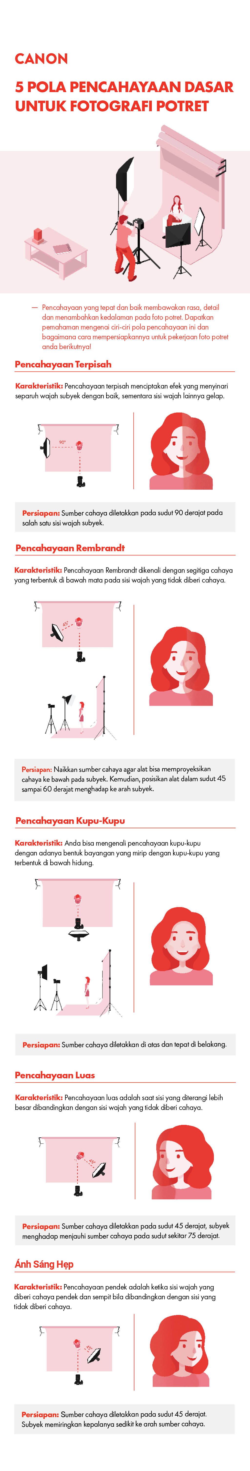 Pencahayaan yang tepat dan baik membawakan rasa, detail dan menambahkan kedalaman pada foto potret. Bila anda baru dalam mengambil foto subyek manusia, dan sedang mencari tips dan trik untuk mendapatkan ambilan foto yang menakjubkan, mengetahui 5 pola pencahayaan yang mudah ini akan berguna bagi anda. Unduh infografik yang mudah-dicerna di bawah ini dan baca seluruh artikelnya dimana kami membagikan karakteristik dari masing-masing pola pencahayaan, suasana yang dibawakannya dan pengaturan sederhana masing-masingnya.Pencahayaan yang tepat dan baik membawakan rasa, detail dan menambahkan kedalaman pada foto potret. Bila anda baru dalam mengambil foto subyek manusia, dan sedang mencari tips dan trik untuk mendapatkan ambilan foto yang menakjubkan, mengetahui 5 pola pencahayaan yang mudah ini akan berguna bagi anda. Unduh infografik yang mudah-dicerna di bawah ini dan baca seluruh artikelnya dimana kami membagikan karakteristik dari masing-masing pola pencahayaan, suasana yang dibawakannya dan pengaturan sederhana masing-masingnya.
