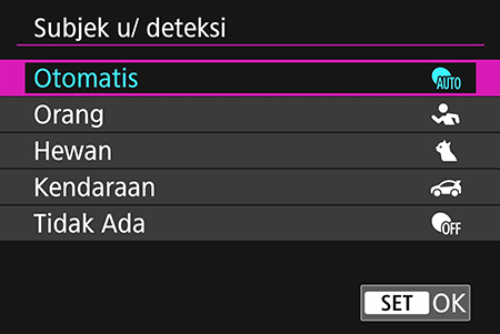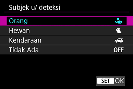Jenis hewan yang dapat dideteksi bergantung pada model kamera Anda. Sebagian besar kamera setidak-tidaknya dapat mendeteksi kucing, anjing, dan burung; kamera seperti EOS R6 Mark II juga dapat mendeteksi kuda.