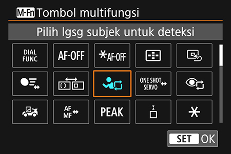 - Menetapkan tombol untuk mengalihkan fokus ke subjek yang terdeteksi meskipun subjek tersebut berada di luar area AF yang Anda tetapkan.