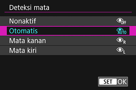 Jika Anda memilih "Tidak Ada" di menu "Subjek u/ deteksi", Deteksi Mata tidak akan bekerja meskipun diaktifkan di menu AF.