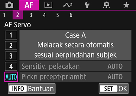 Mengubah kasus Servo AF dapat mengubah perilaku pelacakan secara drastis. Pada umumnya, Kasus 1 atau Otomatis sudah cukup. Tetapi, untuk pemandangan tertentu, atau jika Anda hanya ingin lebih mengontrol perilaku pelacakan, Anda dapat mencoba kasus yang berbeda atau menyesuaikan parameternya.