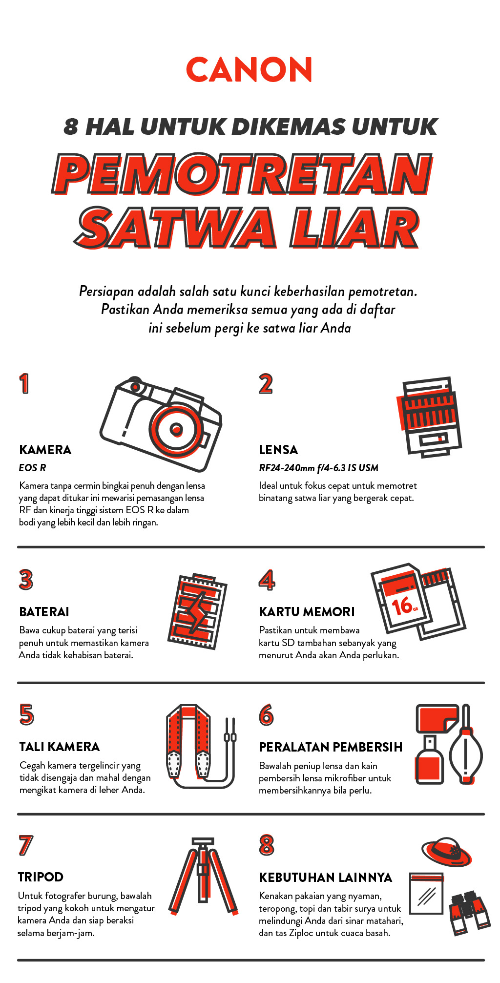 Apakah itu pemotretan satu hari atau perjalanan satwa liar selama seminggu, mengemas barang yang tepat untuk perjalanan sama pentingnya dengan pemotretan itu sendiri.Dari lensa yang tepat, baterai tambahan, dan kartu SD cadangan, hingga tripod yang kokoh dan peralatan pembersih yang tepat, pastikan Anda mengemas barang berikut untuk menjadikan petualangan fotografi satwa liar hewan Anda sukses.
