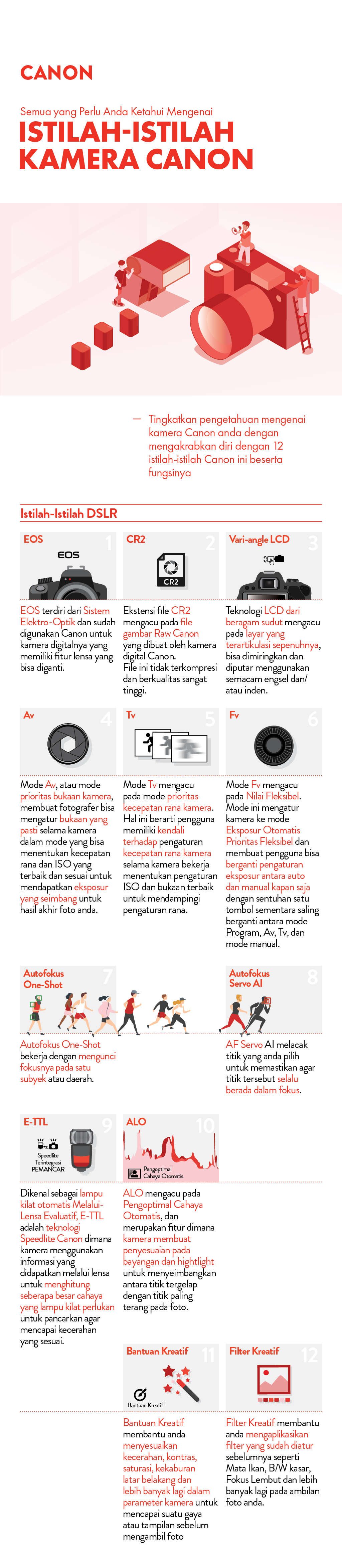 Anda tidak perlu merasa pusing walaupun anda bukanlah seorang ahli dalam memahami 12 istilah ini dan fungsi dari Kamera Canon anda.Kita semua mulai di satu titik tertentu.Berikut ini adalah infografik istilah-istilah Kamera Canon yanag mudah digunakan untuk membantu anda!