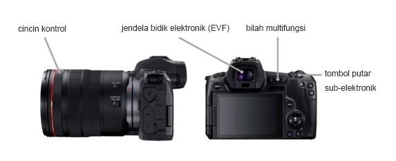 EOS R memiliki jendela bidik elektronik (EVF) built-in resolusi tinggi dengan cakupan sekitar 100% pada panel OLED dengan sekitar 3,69 juta titik. Kamera dilengkapi dengan bilah multi-fungsi di bagian belakangnya, merupakan yang pertama dari seri EOS, memungkinkan pengoperasian ketuk dan geser untuk penyesuaian pengaturan tanpa suara. EVF memungkinkan pengguna untuk mengonfirmasi efek dari pengaturan yang mereka pilih, dan ketika dikombinasikan dengan bilah multifungsi, tombol putar sub-elektronik di bagian atas, serta cincin kontrol pada lensa RF, pengguna dapat menyesuaikan pengaturan secara efektif saat memotret tanpa harus mengalihkan pandangan dari subjek.